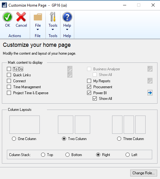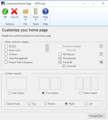 Now you can get back to Dynamics GP, and fill in both the Power BI Site and Client ID, and click "OK" to proceed. Now on Dynamics GP Home Page, click on "Customize" and make sure to check the Power BI component as shown below: